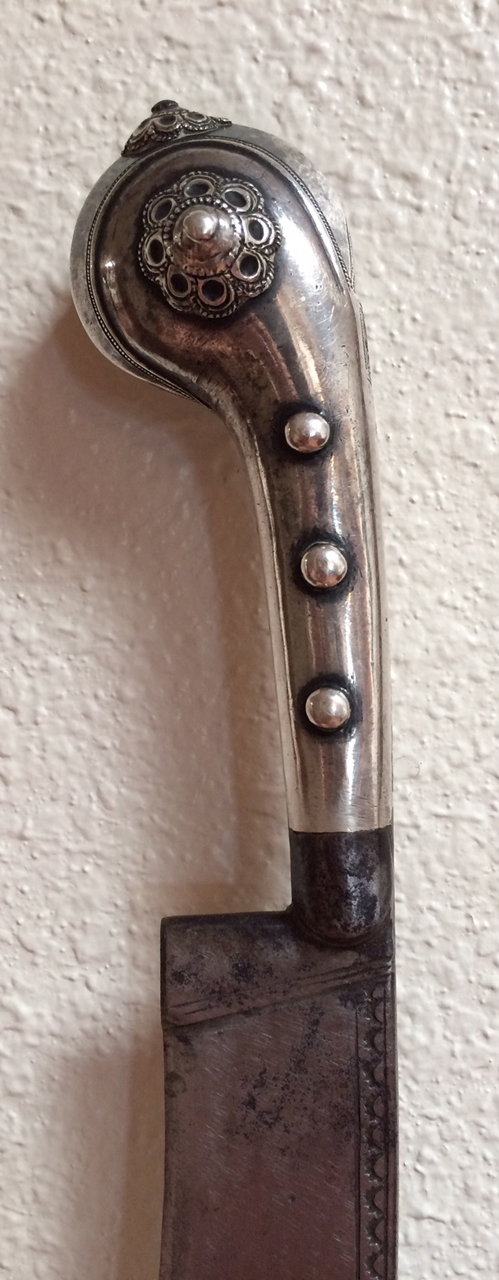 A silver mounted Kodagu pichangatti collected in London in 1958. Complete with heavy sash chain and chatelaine. A substantial heft, the total weight is 616 grams. Examples in the MET and the British Museum are so similar they may have been made in the same workshop.