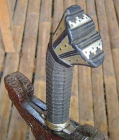 The wood on the scabbard is brittle with age and must be handled carefully, the water buffalo end cap on the scabbard has turned a bleached brown with age and I'm told here (heresay from locals) that the carving pattern is of an old variety (I'll post some other pieces with what they claim is a newer variety, before they went to shaved tortoise shell and mother of pearl.