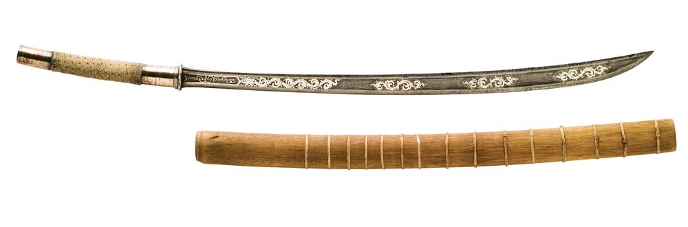 I've added another Burmese Dha to my collection. This one has a very nicely profiled blade, with a deep belly. Appears to have a Rayskin grip, with copper/bronze ends.