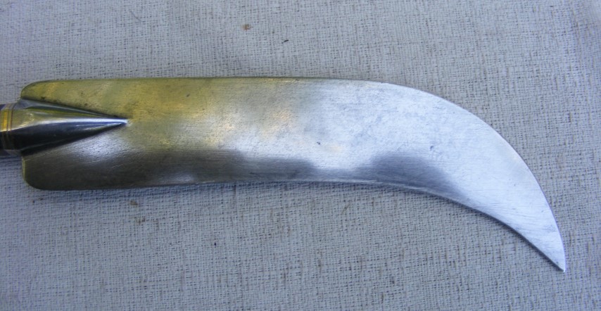 I'm pretty sure the blade has been reworked but you could be correct. It would need to have been a large corvo to start with. What tilts me towards a reworked end of a corvo is the back of the knife at the tip. I think you can see a few mm of the remnants of the original down-curved spine--the deep clip does not go all the way to the point but ends a little way up the spine. That seems a sign to me that the tip has been reworked. Ian. Quote:
