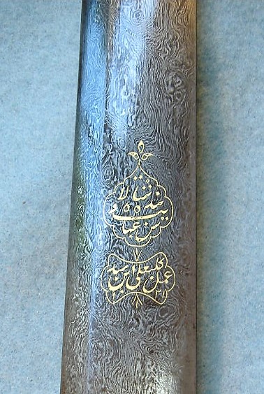 I agree with Battara, beautiful Wooten. The hilt and quillons seem plain for such a blade. I think that I can make out a date in tha bottom cartouche but the gold on the second number in the bottom left hand corner is worn and I am guessing that it is a 2. I make the date AH 1221 which equates to AD 1806 which seems about right for the sword. Others with better eyesight than me may disagree sorry I can't offer any more and thanks for posting.