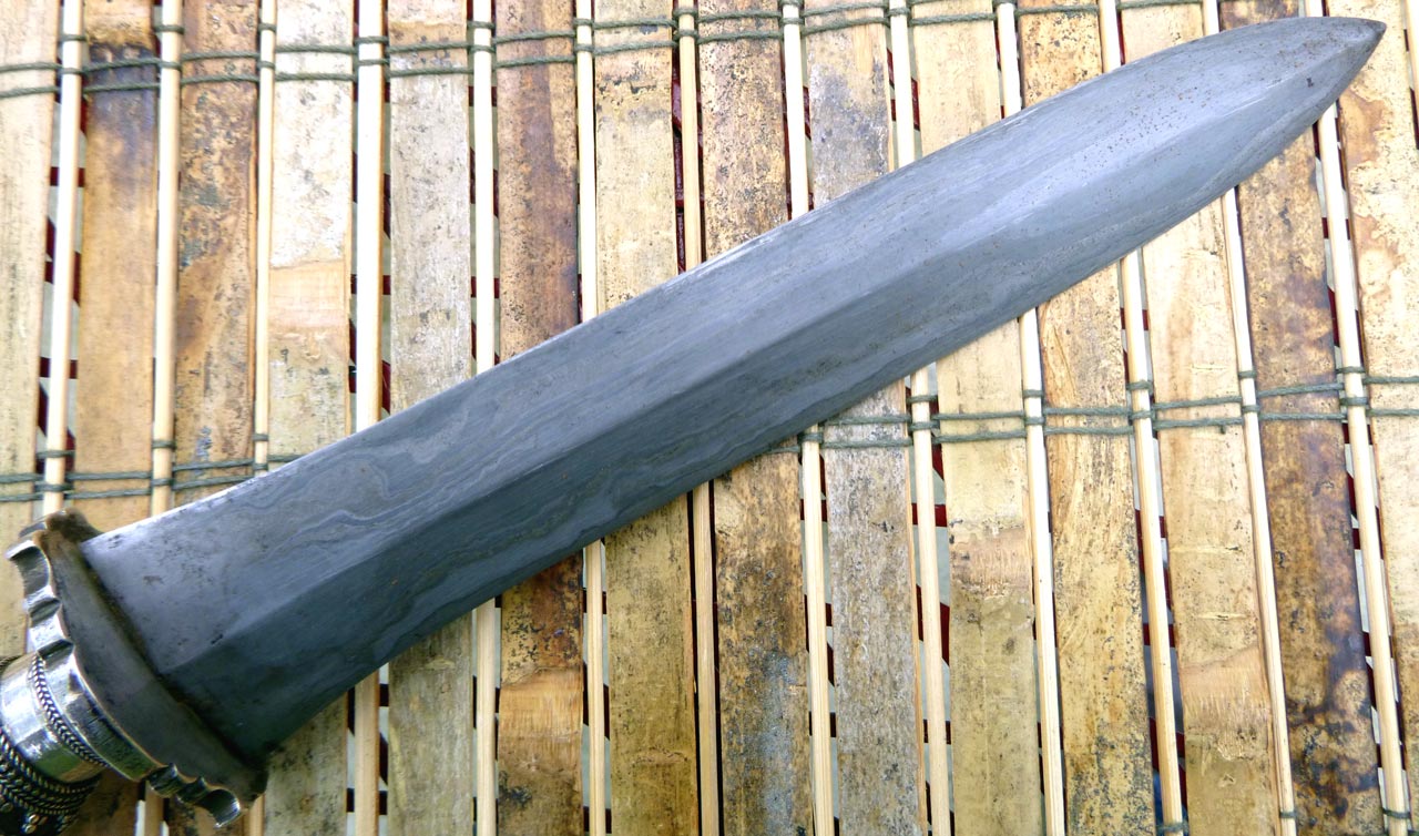 So, I wasn't going to buy any more gunong. Then I found this one on Ebay, described as "Antique Made In India Knife / Dagger with Silver / Wood Scabbard 10.75”. Priced reasonably, and no other bids. The blade was scratched and rusty, and the metalwork was caked with metal polish. A couple hours of pleasurable work and this beauty emerged. Overall 10 3/4" (27.3 cm) long in the scabbard with a 6 3/4" (17.1 cm) pattern welded blade. Banati wood hilt that is a bit straighter that the more modern type. I'm guessing Pre-WWII, but would love input on the suspected age. Seems to be silver fittings. All comments welcome. Thanks!