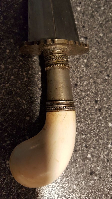 Like everyone else I would like to see a few better quality photos of your new gunong. To me the fittings do not look to be made from aluminum because of the oxidation shown in the first photo you posted, but could possibly be nickel silver or white brass instead. The hilt does however appear to be made of Tridacna shell as suggested by both David and Kai. The groove down the center of the blade I have only seen on blades dating from the 1920's and upward. If I had to guess on the age of this piece I would say second quarter of the 20th century. Better photos will help you to get more precise information from those more knowledgeable on these daggers than I am. Best, Robert |