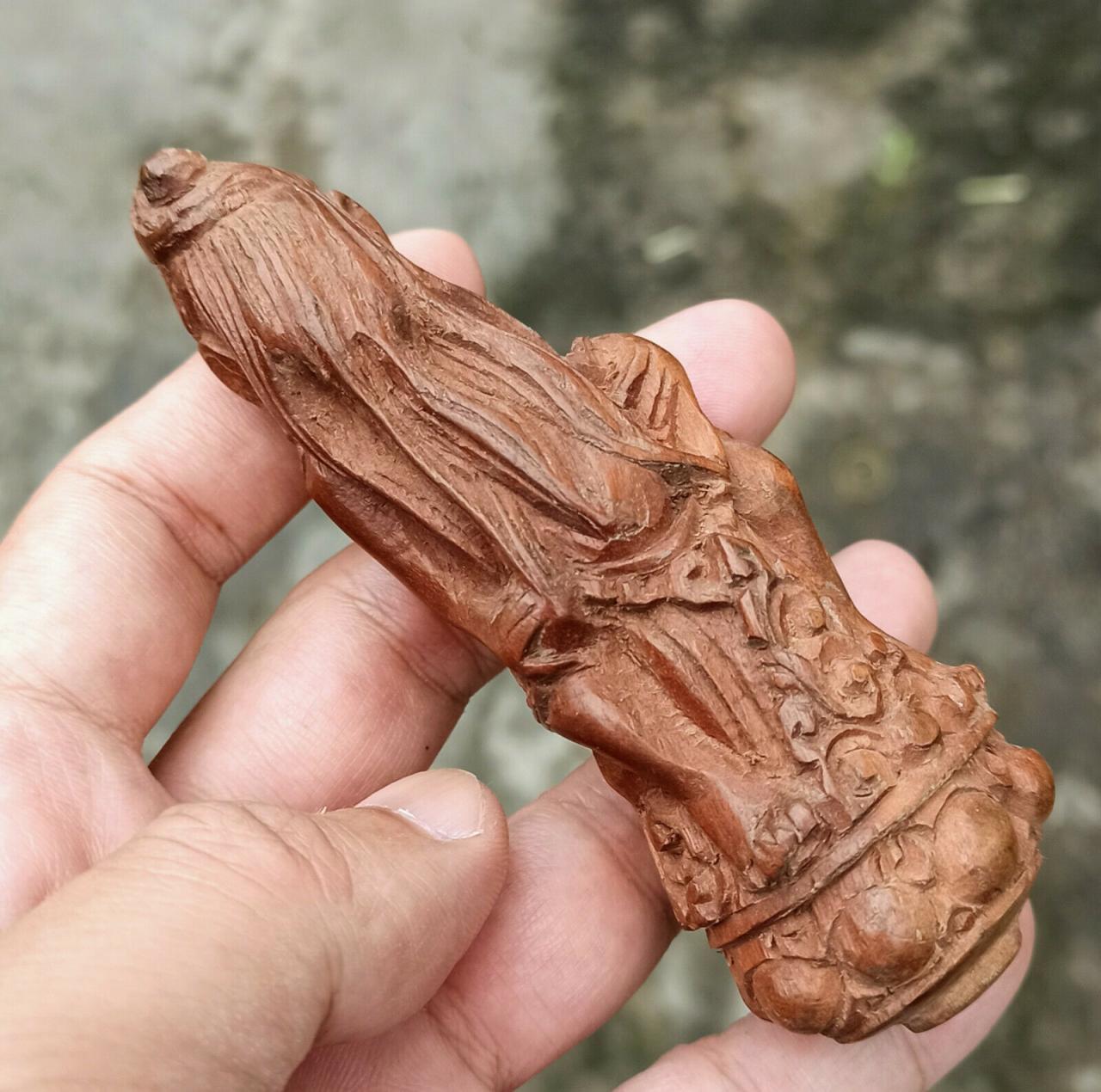 I am interested to know if there are Balinese keris hilts in the shape of Barong? Do you happen to have any photos or discussions on that topic? Would you say the photo below is Barong perhaps or another carving of Nawa Sari? The one below seems to be wearing a mahkota. I also took a photo of the back, and seems like there is something being held in the hand in the same orientation as Nawa Sari. Thanks again! Quote: