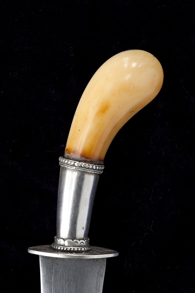 This is my first Punal / gunong which was a surpise in size when it arrived, it is really small while the workmanship and materials are fine; elephant ivory, buffalo horn, laminated blade. In the bulb some of the inlay dots are missing, the middle one on the right hand side seems to be lead or alu and appears to be fixating the tang. Is that a common constuction on these knives? And is this size an abnormality, maybe made for a woman or child? All thoughts are wellcome. Kind regards, Eric. |
