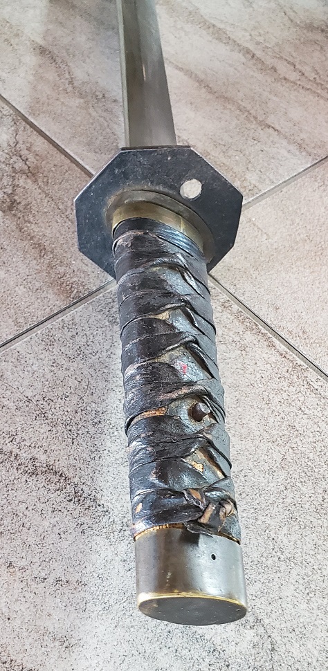 On [Ihwando[/I], of which there are several subtypes, there is a combo of Japanese and Chinese design elements. The grip wrap and the habaki are representative of the former, and the suspension system of two bands and a perforated bar along the dorsal edge of the scabbard is Chinese. Some hilts had a flaring oval "mandarin hat" pommel in the Qing fashion. Blades, depending on subtype, are a blend of stylistic traditions. This scabbard is covered with a coarse fabric which is lacquered-over, this is typically Korean manufacture. |