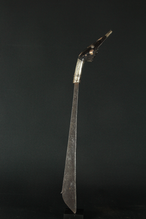 It would be very interesting to see any examples that members own, or have come across in museums, articles, etc. This example is 48.5 cm, blade 33.5 cm (5 mm thick at the base), hilt 15 cm. (the whole sword very light in weight). Van Zonneveld has an entry for the name (simunung) but no description. C. D. La Rue, ‘The weapons of the Asahan Bataks’ (Papers of the Michigan Academy of Science Arts and Letters, 16 (1932), 73-104, pl. V-IX), has one paragraph (p. 92) describing a simoenoeng, with the same sort of blade, with the protrusion on the back, but with a hilt more like a hulu tapa guda (Van Zonneveld, p. 55), without the extension at the top in the usual examples (with a very small photograph, pl. VI, no. 27). Wilhelm Hein, ‘Indonesische Schwertgriffe’, Annalen des K. K. Naturhistorischen Hofmuseums, XIV (1899), 317-58, has, p. 345, a drawing, fig. 73, of the hilt of a [simunung], called by Hein the hilt of a Timor-Batak sword, briefly described on p. 346, as belonging to a Schwertmesser “Pué suring” of the Timor-Batak, from the collection of Theodor Josef Hirsch [1838-1916], Inv.-Nr. 45.873. (A reference I owe to Michael Marlow.) [Auction catalogue of his collection of coins and medals, no weapons, 2 Apr. 1900 and following days, Brüder Egger, Vienna.] There is a colour photograph of an example in Achim Sibeth, Living with ancestors. The Batak, peoples of the island of Sumatra (1991), p. 164, fig. 213, 3rd item from the bottom. Does anyone know anything about the collection of Hirsch (a few lines above)? |