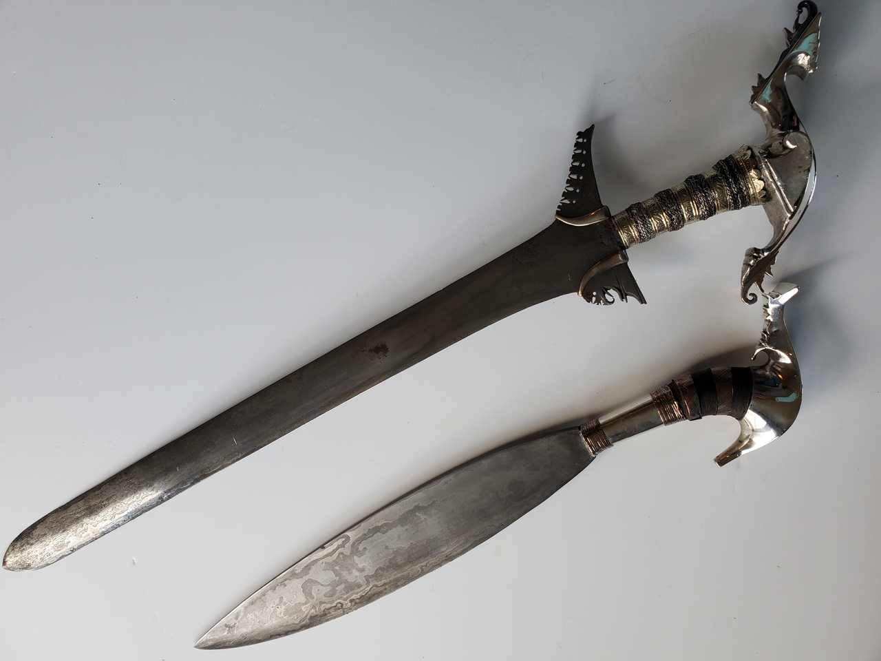within the first hour these two pieces which i have only seen in pictures popped up: a solid silver pommeled barung and a silver junggayan kalis. they are about one of the most exquisite Moro pieces i have ever laid my eyes on. somehow i wanted to believe that these two were commissioned by the same man.