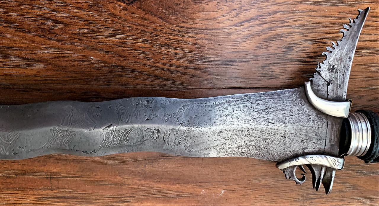 Scarf welding is not particularly uncommon on Malay sundang, but this is my first experience with it on a Moro kriss. The forte seems to be from steel more comparable to 'pamor' steel, but you can easily see where that stops and the more imaginative pattern weld begins.