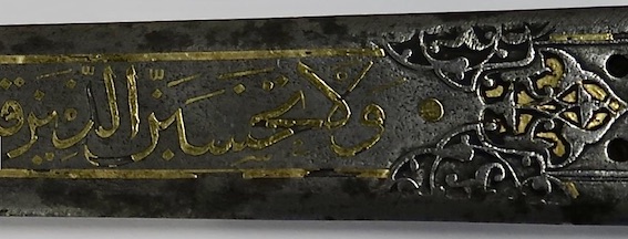 This type of script is quite contrary to the heavily acid etched inscriptions typically seen on Mahdiyya period sword blades and other weapons, with this form known as 'thuluth' a more rudimentary 'pen' of the Islamic script.