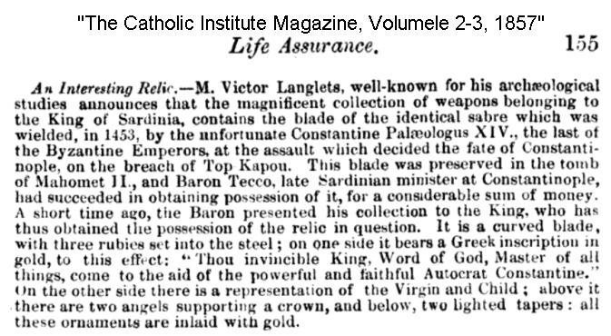 In 1857, Victor Langlois publishes in "Revue archéologique I, pp. 292-294" a study entitled "Notice sur le sabre de Constantin XIV (sic), dernier empereur de Constantinopole, conserve a l'Armeria Reale de Turin" (Teisani's note: Langlois / Langlets' article is also referenced in "The Catholic Institute Magazine, Volumele 2-3, 1857, page 155" (see the attached picture). It's about a sabre with Damascus steel blade, brought from Constantinople by Baron Tecco, former Minister of the Kingdom of Sardinia, and later given as a gift to King Victor Emmanuel. Baron Tecco had bought it (with a considerable sum of money) from a local merchant, whom had acquired it from the guard of Mehmed II's tomb. Langlois believed that the sabre belonged to the last Byzantine emperor, Constantine XI Palaiologos, based on the gold inlay inscription, "Thou invincible King, Word of God, Master of all things, come to the aid of the powerful and faithful autocrat Constantine". It is only on one side of the blade.