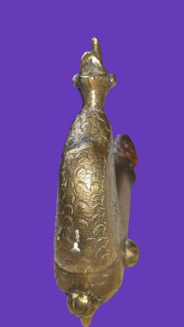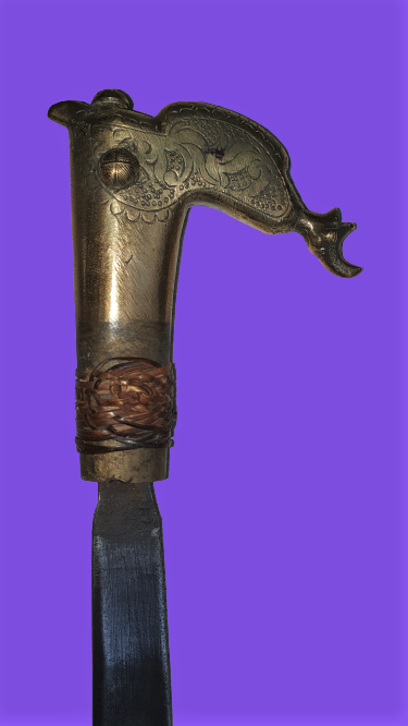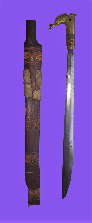 Not long ago I came across this from the auction house as "African knife" described mandau with brass hilt. The scabbard seems to be a newer replacement, the blade seems to be old, by the handle I am unsure but it seems to have some good age, the pitch ferrule is missing and one of the "knobs" and the rotan binding at the handle is just a fragment. It's the first mandau I've seen with brass hilt! 74,5 cm inside scabbard, 63,5 cm without, blade 51 cm.All comments are very welcome! Which Dayak tribe? Age? |