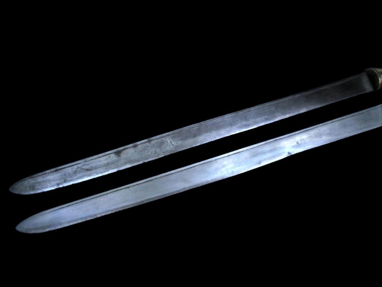 ![]() , what you show here is an Omani sword Sayf or Saif, perhaps called by some a Katara but I am not even sure that Katara the correct name for them having always understood they are a Sayf or saif.They are dancing swords used by Omani Arab people, they have thin flexible or semi flexible double edged blades, there is a whole post dedicated to them here on the forum if you need help identifying yours. This sword is single edged sword with no flex to the blade and round sectional hilt and mounts, the spine is also much thicker than you will not find on any any Omani Saif, and I have had a few old ones in the past. The origin is quite clear here, south east Asia and likely Thailand as I suspect and the Khmer border regions of that country or 19thc Cambodia, the blade length is typical of the region for dha and daab, but what is not is the straight blade and the hand and a half hand hilt, that is a very unusual trait for dha or daab. There is a type of royal sword from Thailand which is called a Phrha Kan which is the Thai name used for a double edged Thai royal sword, in Khmer - Cambodian it is called ''Preah Khan Reach'', and although the hilt on my sword is in typical round section with typical and obvious lotus form pommel it would not be a Phra Kan as it has a single edge. I think this twinned pair are for the south east Asian interest guys who maybe able to help with it, having had many Thai swords and Few Cambodian Dav in my time I have never seen anything like this, and I might add neither have any of the Thai collectors I know. It is a mystery, one that has taken me over a year or research and still I have found nothing like it, not in the west or in south east Asian historical records either. more pics here, forgot to add when i first posted that the sword has a twin which has not been cleaned up yet, that one does not have a forge weld edge repair though. I have included a pic of an old Cambodian sword with the same type hilt and double edged blade, which is much older at around 13th to 15thc, I wonder if the style did not continue and I have been lucky enough to find a fighting pair ??. They came with 2 very unusual large knives from the same region, I may show them later when cleaned, but for now I am making 2 scabbards for these with lacquered wood as is traditional and would go with the hilt, more to keep em safe than anything else. ![]() Snody