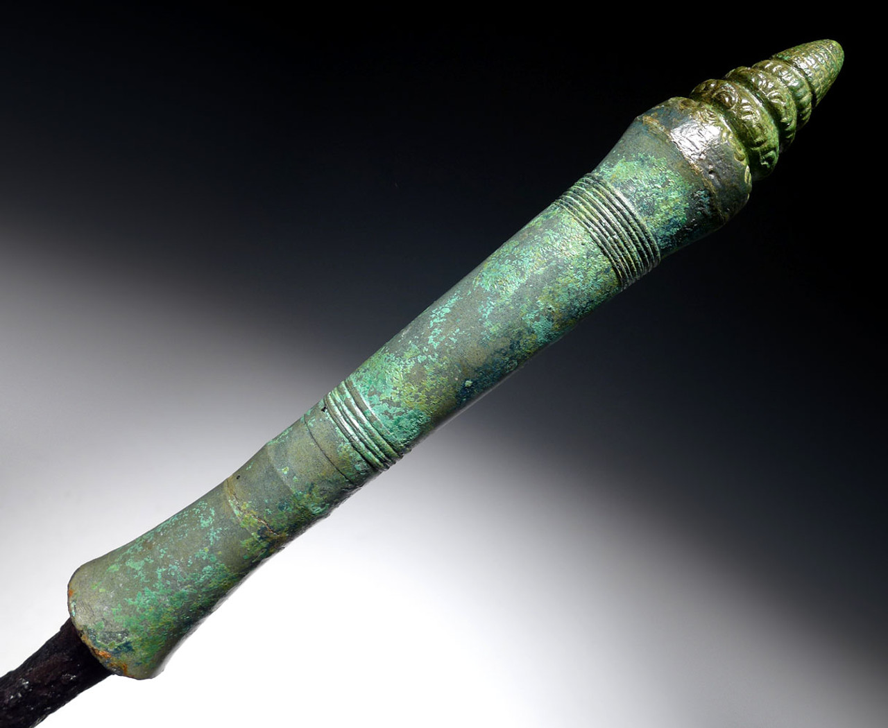 I've looked at these several times trying to think where in mainland SE Asia they may have been made. It's as though they are from everywhere and nowhere. I'm inclined to think they are composites with a heavy influence from a European. First, the blades look to me as though the tips have been reworked. The thin fullers run through the end of the blade, which suggests that the spear point was not the original form. The thin fuller running just beneath the spine reminds me of some northern Thai/Lao/Southern Yunan daab, and these might have come from our old friends the Achang from HuSa in southern Yunan. The hilts look standard Thai/Lao to me, and perhaps not very old. The two long knives are interesting. The large stag hilts look too big to be from the small deer in mainland SE Asia. Hence I think another source such as Europe or the U.S. The fittings are standard Thai/Burmese/Shan ... The down curved hilts are reminiscent of some ivory-hilted Burmese examples. The reasonably heavy blade is also consistent with some Burmese examples, but other areas of the region also had similar heavy-bladed knives. Although the knives and swords came from the same collection, they don't necessarily have to be from the same region. Pushed to identify the origins of these interesting pieces, I would say they each have mixed parentage with evidence of newer hilts added to older blades. Given that they came from a British collection, I would say a recent owner had modified them and replaced the hilts. Some of the reworking of these pieces was likely done in mainland SE Asia. |