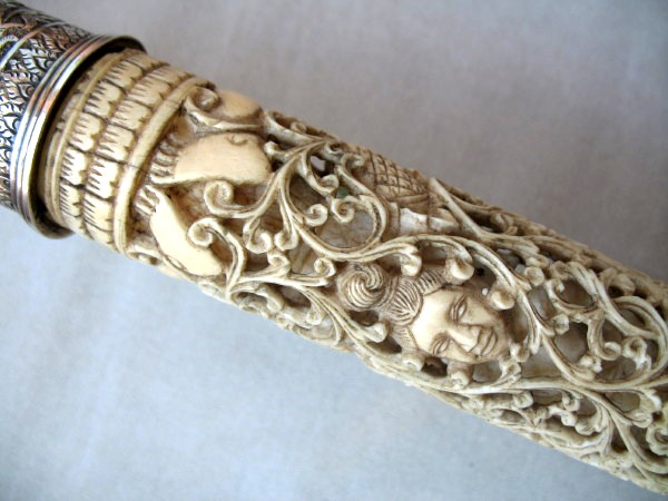 I thought that I would share a recent addition to my collection. It is a Burman dha (from Burma, specifically the Burman people). The pierced ivory work of the handle is wonderfully intact, and I understand is a style characteristic of Molmein, in southern Burma (near the peninsula). Ivory carving has apparently died out in Molmein itself, but the tradition continues in Rangoon. I have another dha with the same style handle, which has a sleeping Buddha reclining inside, and similar-looking characters peaking out of the vines, but I can't make out if the figure inside this one is sleeping (it looks kind of like it is climbing or standing on a rock).