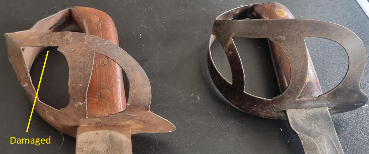 I finally have the klewang in my hands now and can compare it to a “regular” klewang. I picked an M1911 Hembrug as I think that is the most common used klewang which also served as an example for the M1940 and M1941. The Hammer/Anvil version is almost 25% heavier while the hilt is more than 15% thinner so all the extra weight is in the blade. I can imagine it does not handle as well as the M1911 just because of the weight and the different balancing point (The M1911 balances at 14.5 cm from the hilt basket while the Hammer/Anvil balances at 17.6 cm from the hilt basket. I will check this balancing point later on other klewangs too). When you have both klewangs in your hands it is an easy and quick conclusion that the hammer/anvil is quite roughly finished and appears to have been hastily put together. The basket hilt is not screwed on top but forged and the blade fuller is handmade as it has many irregularities (by grinder?). On the example I have, the hilt basket is damaged as if someone has put a heavy weight on it, I don’t think it is battle damage. And, in general, the klewang can sure use some “taking care off”