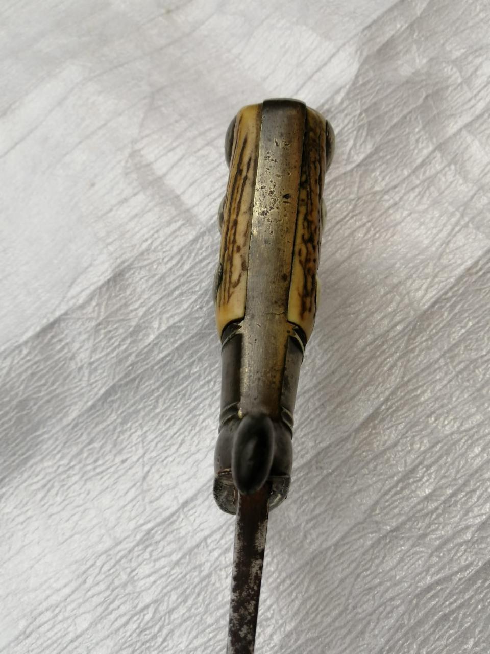 I see a German hunting sword.The brass hilt with the staghorn onlays fourth quarter of the 18th.century.The blade much older, from the second half of the 17th.century shows the Solingen running wolf, a mythological decoration.Good old blades in combimation with a younger hilts you often find on many hunting swords of the late 18th.and 19th.century.The plate on the end of the grip should prevent water from scabbard.These kind of double edged blades mostly belong to the Felddegen in early times and seems to be shortened slightly. The original blade of a hunting sword is mostly single edged and with a strong back.