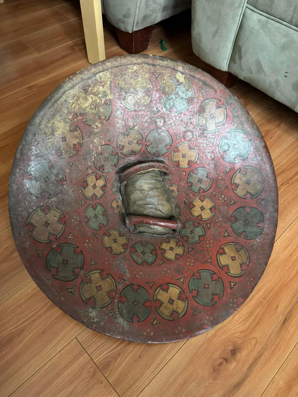 I don't really know anything about shields but, do many have such an elaborate decoration on the inside? Then too, it appears that the hand holds and hole for the hand were added after the design was made. It seems like a lot of work for nothing to make a complex design and then destroy part of it. What is the diameter of the shield. The designs look Japanese to me. I know this sounds crazy but could this item have started life as a Jingasa?! Sincerely, RobT |