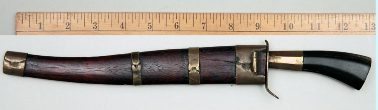 My example is probably newer but perhaps it will help with origin. Specs: 9.875" Girunting Blade, Dark brown wood hilt with aluminum inlay (pommel inlay missing), Brass ferrule and ”S” shaped aluminum cross guard, Wood sheath with aluminum inlay, aluminum and leather throat, Brass and aluminum chape. Sincerely, RobT |