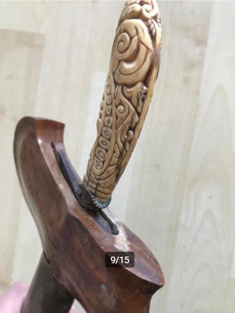 i post some pictures from a Keris Hulu that i bought through the internet, It is not yet arrived at my place but i would like to share some images the seller provided. I am not sure if it is bone ivory or antler, but the shape of the hulu is something i haven't seen before. So i hope someone can shine some light on it and enbroaden my knowledge, Thanks for now. Regards, Martin |