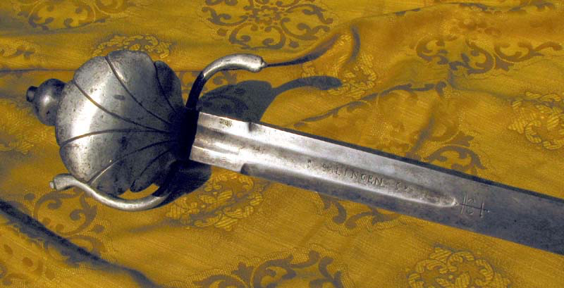 The use of the 'T' with 'O' above and topped with crown was a Toledo town or export mark indeed used in Toledo in 16th into early 17th c. However as far as I have seen is not placed asymmetrically on the forte of blades, but centrally as with makers punzones. By the early 17th c. Solingen was spuriously using Spanish names and markings, as well as Munich. The only marking or device specifically attributed to Passau as far as sword blades was the stylized chop mark 'running wolf'. In the plate of 'running wolf' markings in Wagner and Bezdek the example accompanied by the 'Toledo' mark (#12) is likely a Solingen blade. According to Wagner (1967) the running wolf was placed on blades being sent by Solingen to Passau. Passau was a center where various armorers supplied the mercenary groups who often assembled there pending advance into campaigns. The Toledo mark (crowned TO) it seems would typically be accompanied by makers punzone, which seems in accord with this example. Solingen often used spurious Spanish marks incongruently which of course is not surprising, While German makers used Spanish marks spuriously, a number of German makers from Solingen worked in Toledo, further complicating matters. The stamping and marking of blades was not always consistent, nor regulated. The skills, equipment (stamps and tools) and often literacy (including language) often mitigated the style and application of markings could of course vary, while certain conventions were typically followed. The familiar ME FECIT did normally have Solingen added, in the manner in Toledo the term EN TOLEDO was often used. However, in cases the words ME FECIT used in apparently representative application without literal consideration has often been seen (as in Royal Armories example, pre 1916 acquisition...thank you Radboud for these excellent examples!!). The use of crosses bracketing words, names, phrases goes back to the ecclesiastic associations of the Frankish 'Ulfberth' blades of N.Europe 9th to 11th c. where that 'name' or 'term' became a hallmark of blade quality . The crosses placed bracketing this word as I have understood has reprentation of the Bishop as the church often controlled blade making in those times. Sword blades were therefore blessed much in the manner that later markings (such as Passau wolf) were talismanic devices. The use of crosses in multiples in configuration are more in the convention of the Jerusalem cross, again to ecclestiastical parlance. The 'anchor' which was in the form of the chi rho and globe and cross was a device popular in Spain, but again adopted by Solingen in their affectation from Spanish blades. These were often embellished and altered with numerous cross bars and perhaps symbolic dots etc. As far as this sword type it is basically an arming sword of the 'Sinclair' (so called) form common in N. Europe from mid/late 16th c. well into 17th. The distinctive features are alternating quillons and often globular pommel, while the hilt elements and guards can vary , but shell guard and more complex baskets can occur. It does seem by the number of examples, that the 'shell' type guard was well known, and these can occur with various blades, though it seems usually shorter. These shell guard type with shorter stout blades often found use at sea in the mid to later 17th c. to the point that apocryphally, pirates called their cutlasses colliquially 'shells'. Well, I wanted to keep this brief ![]() Tolstoy, over and out, |