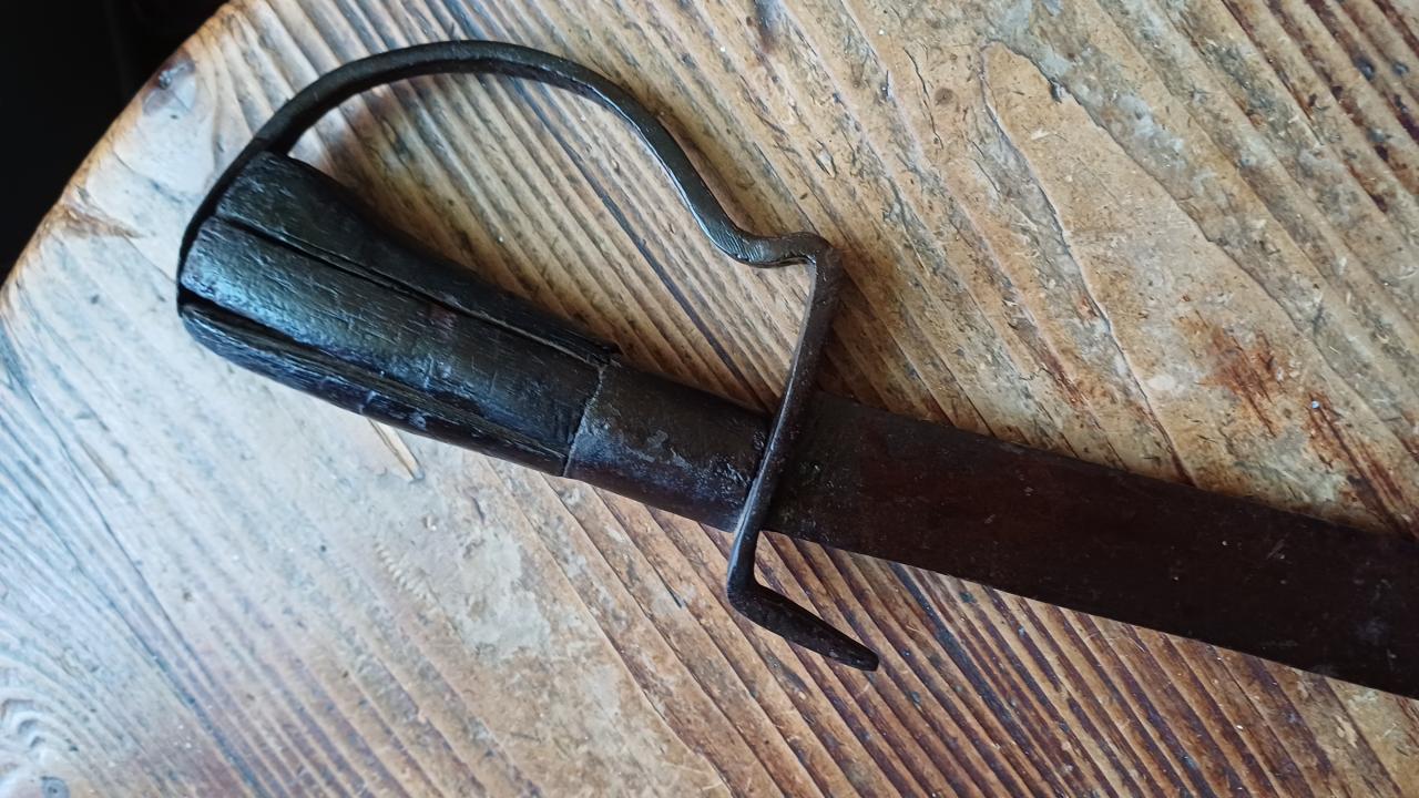 However this is the first such saber I've seen with a P guard, and a fairly thick one at that. And most of the ones I've seen from Luzon have more of a forward curve to them whereas this one simply curves back (although it does lean forward a bit as the grip is angled ). It is quite worn and has a deep dark patina, and I think it has been coated with something like varnish (as is often seen), but I can't really narrow it down much in time (I guess the default assumption would be late 19th/early 20th century) as there are no markings. The grip is split to the bone but it feels solid as it's helt together by the ferrule and the peen - though the tang is quite corroded as can be seen through the crack in the grip. There are some old nicks in the blade that hint at use (though in what capacity is of course impossible to say). If anyone can narrow it down for me in time and/or place, it would be much appreciated. Not in the best state, but this one cost me approximately three pizzas, so I took a small gamble.