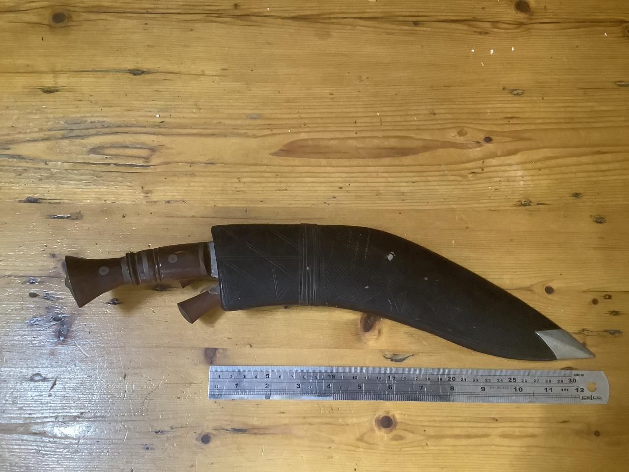 Made in Dehradun.. recently made. Last 20-40 years . They still make that "model" . There's another one the make with a horn handle and aluminium buttplate .. these have never a functional chakmak or karda.. as the Indians don't really know the little chakmaks use. (Sharpening and fire striking) So they are just rough objects. Even on old India copies, if they do include them they are just two little knife shaped things. Or sometimes two small identical knives . The chakmak/chakmaag (the Mongolian tinder box with a striking steel) was previously known in India but it was associated with military attire and just faded away with matches.. where as the Nepalis kept in in their kukri scabbards to the present day. Although you'll be hard pressed to see a Nepali who and strike a fire with it these days. Maybe some very old men..but they know what it is. |