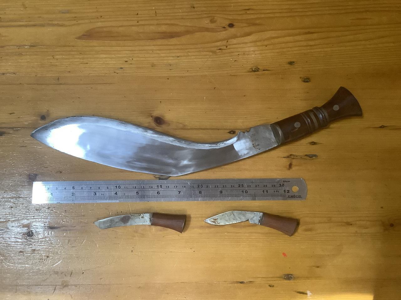 I believe this kukri is from Nepal, made some time before the late 1970s. I assume it’s a souvenir type that is typically seen? I’m not sure of its exact origin in Nepal, my uncle picked it up when he was there in the late 70s. The blades is ~29.5 cm long. The blade spine is 1 cm thick. The handle is hard wood with rivets and what looks like brass pommel and ferrule. The two by knives are of similar construction. One is sharp, the other dull and squared off. Scabbard seems like hide or similar with very rudimentary carved pattern and a white metal chape. The wire loop is from its days hanging on my uncles lounge room wall! Thanks again - all comments welcome. Last edited by rickdeckard; 11th October 2025 at 01:56 PM. Reason: Additional information |
