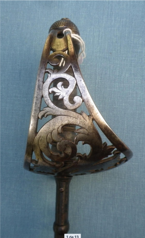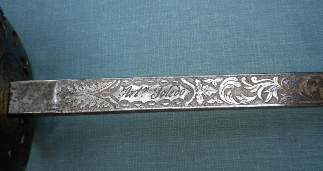 It is a British Engineer Officer hilt devoid of gilding, with a Spanish Cavalry Officer blade, dated Toledo 1850. Thinking that the match happened in the XIXth century, what was it, a British Officer wanting a Toledo blade or a Spanish Officer wishing to use a steel guard? |
