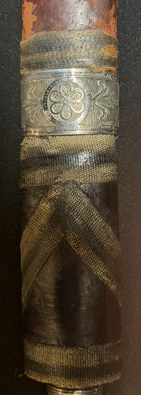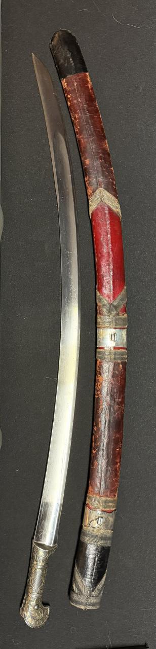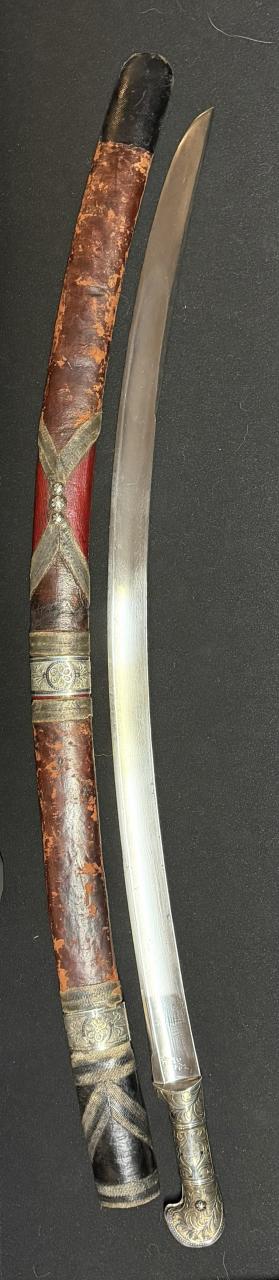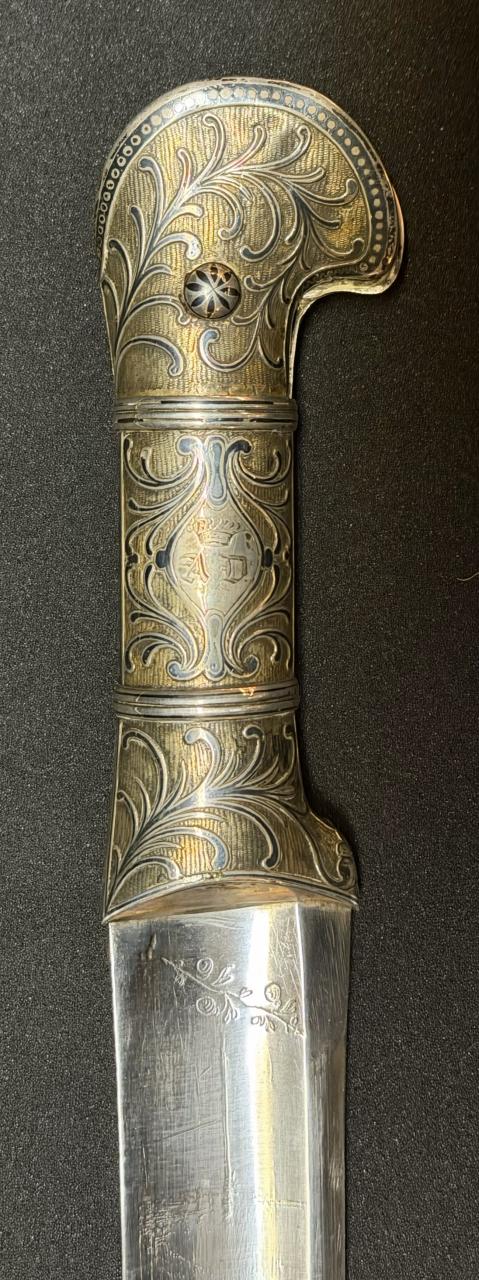 The shashka with partially gilded and nielloed silver grip and mountings on the scabbard, has the initials "AD" under a crown with 9 pearls (spikes). Between the "ears" i has the date 10. november 1830 written in Russian. If the crown is a Russian noble crown it could be a Baron? And who could that be? Adrian Denisov? Somebody else?