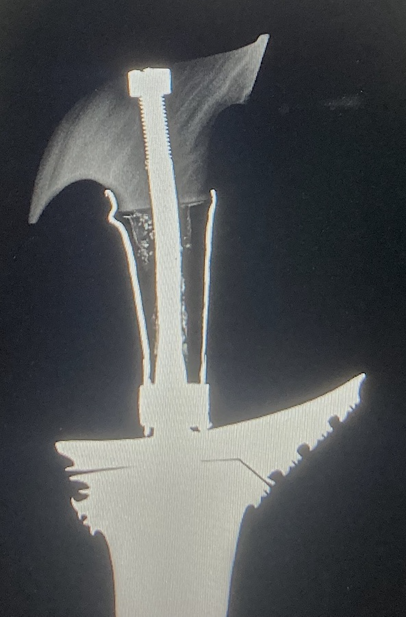 This is a rather nice 19th C Moro kris (probably Maguindanao) that has had an interesting repair at some time. The pommel has a section cut out on the top and a large screw nut is visible. This suggested a threaded tang underneath, so I persuaded my friendly veterinarian to allow me to use his X-ray machine again to get a better look at the tang.