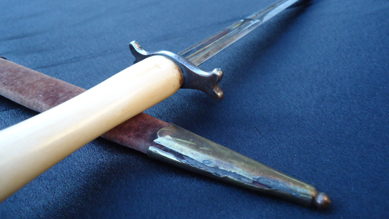 I just won this unusual bone hilted dagger. The seller suggested that it could be a Freemason dagger!? Which sort of bone could it be? The dagger is 31,4 cm long. The cap at the hilts end is silver and engraved. Any suggestions? Age? (I guess 19th c.) Thank you in advance, Detlef |
