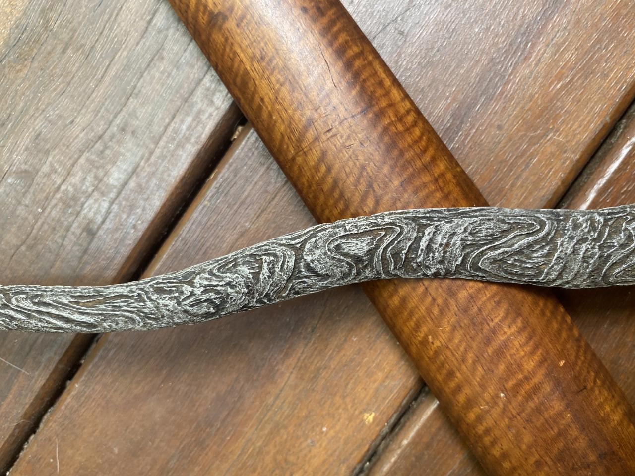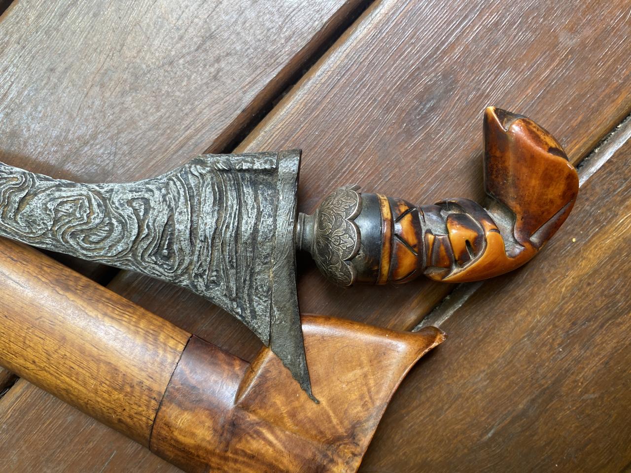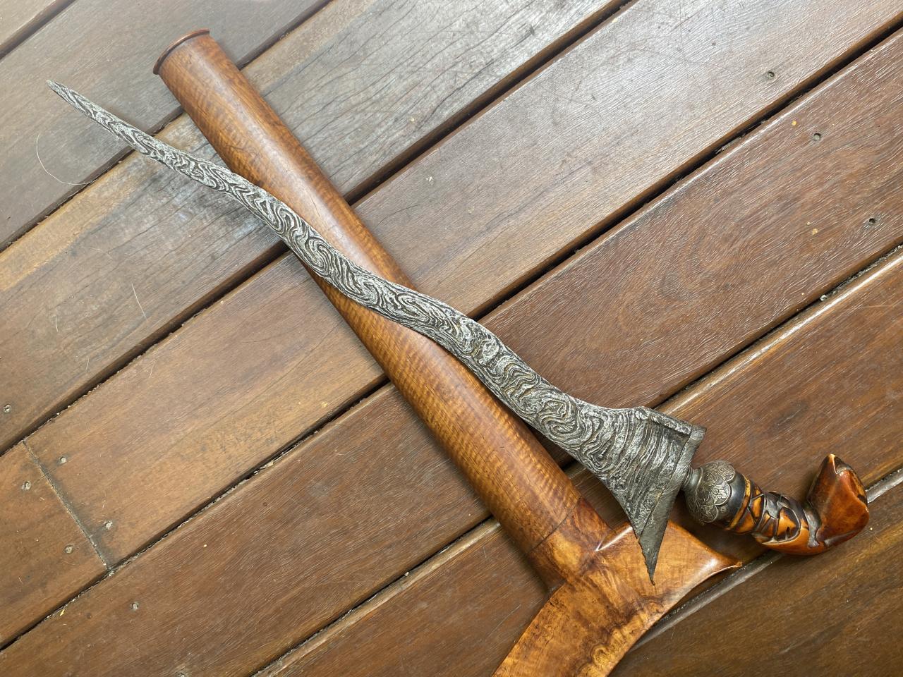 Blade is slender and dainty and looks to me like the Javanese pamor lawe saukel; overall seems like a Javanese product. Blade is old, but has been well-fitted to the Malay-type sheath.