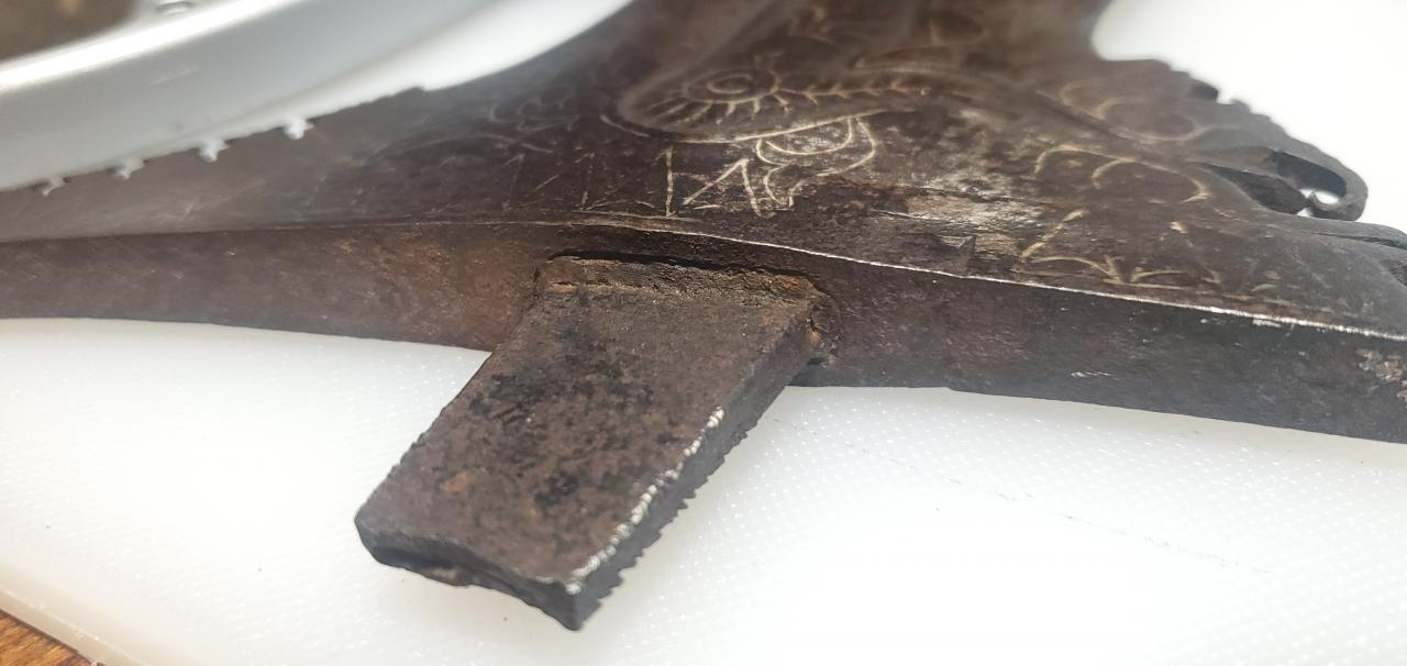 8) Inlay: Both sides of the blade contain the same, intricate inlay (kinitah?) that extends from ganja to tip. Inlay material is almost entirely present, but the few voids present reveal deeply cut channels (~1.5 mm).