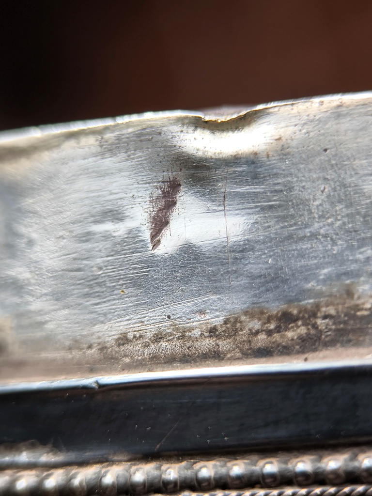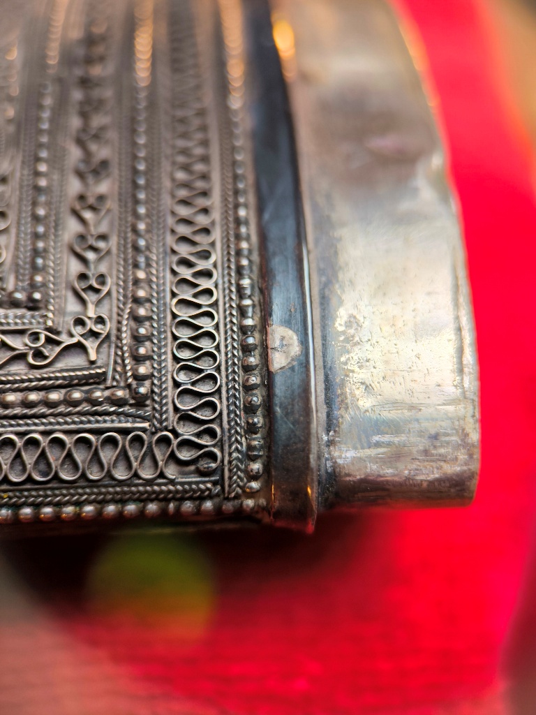 thank you for accepting me here! It is my first post here. I recently bought few late 19th century arms and some older edged arms accesories from a private Swiss collection in conjunction with other items that I was really keen of. I do not think that it will start a new passion for me, but there is at least one arm that I am curious about because I am a fan of the Omani perfume house, Amouage, which had masculine bottles inspired by their Royal Khanjar handle. so, one of the arms is a Khanjar. 32x22cm, 611grams. the scabbard and handle are covered in high-quality silver sheet and filigree work over a wooden core. the filigree features twisted wire, teardrop motifs, and concentric rosettes of very good execution. suspension rings are of the pyramidal cone type. the reverse of the scabbard retains its original natural brown leather backing. what I would like to ask you is if you may help me identify the multiple hallmarks that we may see on the Khanjar. multiple stamps are present on the silver mounts of the scabbard, I tried to catch them on the photos below. additional mark is present on the blade spine, in the photos is the first mark. if you may help me, I am particularly interested in understanding whether these marks indicate a specific region of Oman, a workshop, or an import/export hallmark. thank you for your help! |