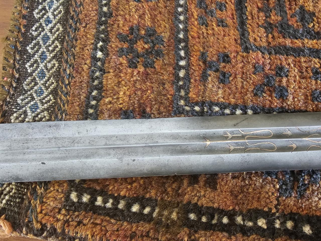 I have seen a few of these now. I was pleased to score it on Ebay for a very reasonable price. Quality is very evident in both blade and fittings. Some of the blade inlay has a rose tint while other areas are more silver. Was it common to combine suasa and silver inlay? The seperate ganja and design details point to late 19C from what I understand. I have seen a number of similar builds online. The band at.base of of pommel/hilt is thick plated suasa over what appears to be bronze. I believe the othe bands are fully suasa and the woven bands, ferrule and pommel are clearly silver but I.do not know quality. The arch-like inlays at base of blade and spur/arrow like inlay symbols are also seen on other examples