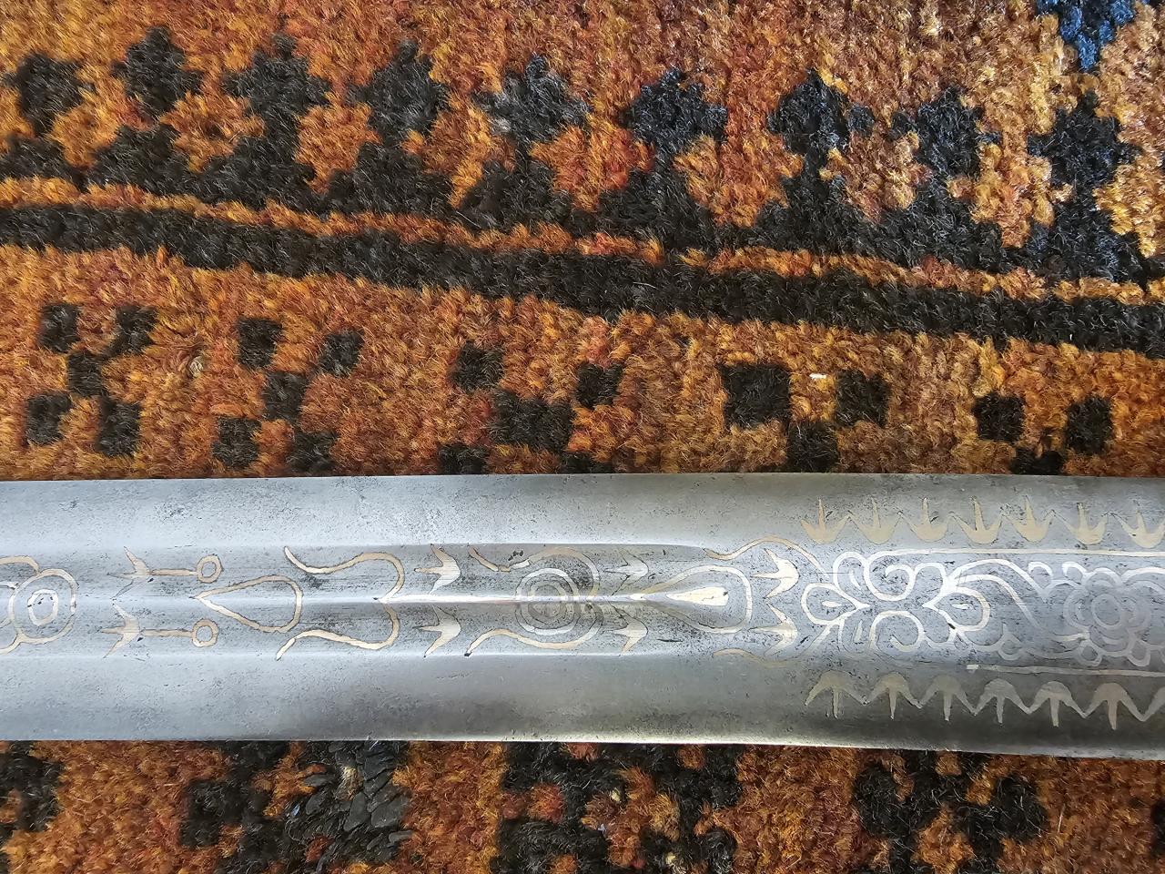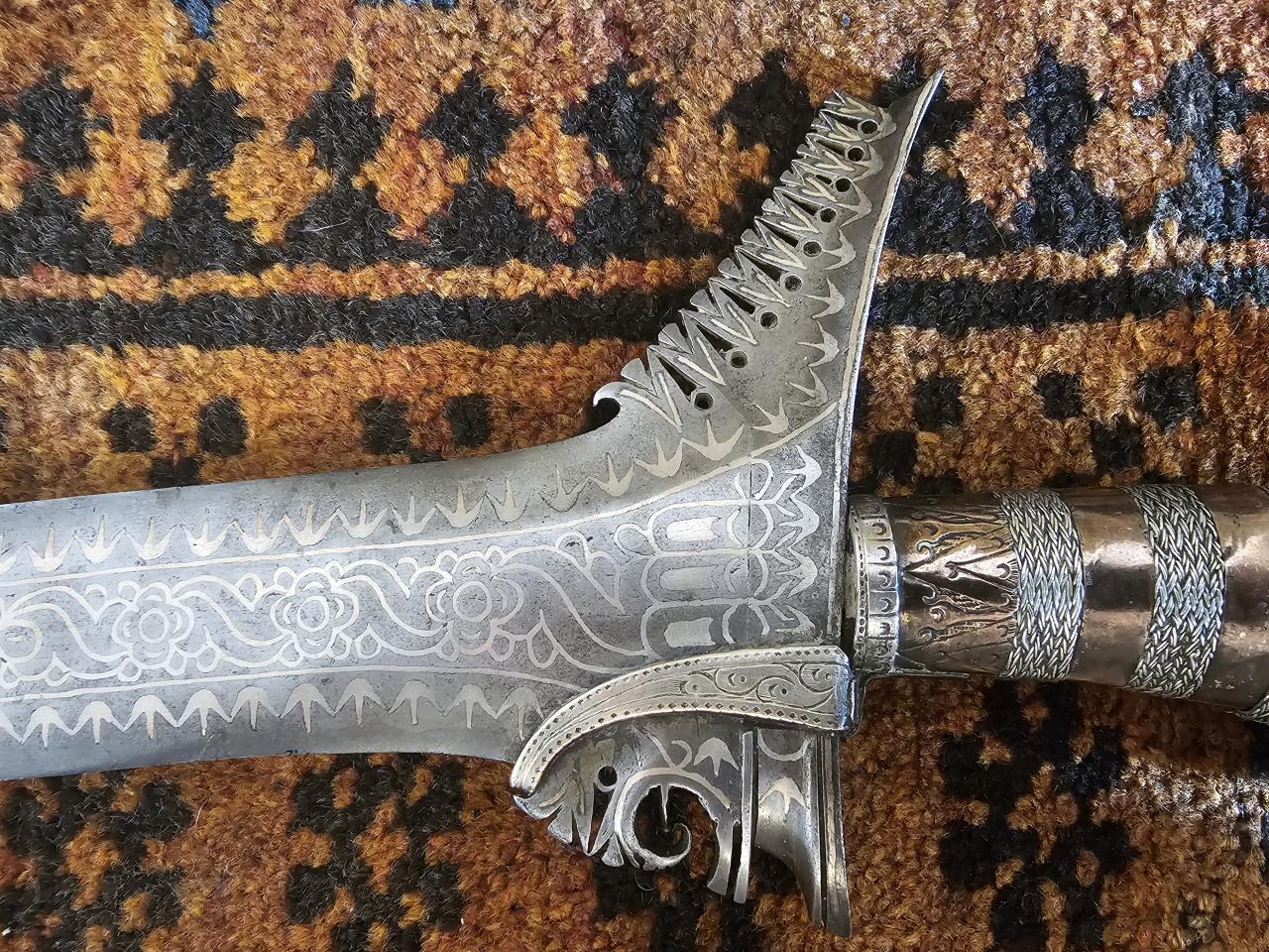 The floral inlay patterns are broadly reminiscent of islamic iconography, and the curved, circular, and drop shapes running up the fuller are reminiscent (to me) of Dayak or Batak iconography. Keen to hear hear current thinking on these. |