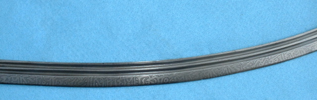 The blade on this piece is decorated with etched calligraphic motifs. There are two die-struck "eyelash" marks, and X stamps in the fullers, which are common on European blades made for the Eastern market. One can also see that a long central section of the spine is "sunken", i.e. at a level below that of the forte and the yelman. This latter characteristic is seen on a number of Eastern European sabers. A remarkably similar blade, minus the markings, is seen on a Polish "karabela" saber (Historisches Museum der Stadt Wien, inv. no. 126244) published in W. Zablocki, CIECIA PRAWDZIWA SZABLA (Warsaw: Wydanictwo Sport i Turystika, 1988), pp 208-9. A closely-related specimen is on pp 206-7 (same collection, inv. no. 127454). That one is interesting for a dorsal fuller on the sunken central section, which parallels a Chinese example (Metropolitan Museum of Art, acc. no. 36.25.1473a,b); I discussed this and their Polish counterparts in my article "Some Notable Sabers of the Qing Dynasty at the Met. Mus. of Art", MET. MUS. JOURNAL, Vol 36/2001.