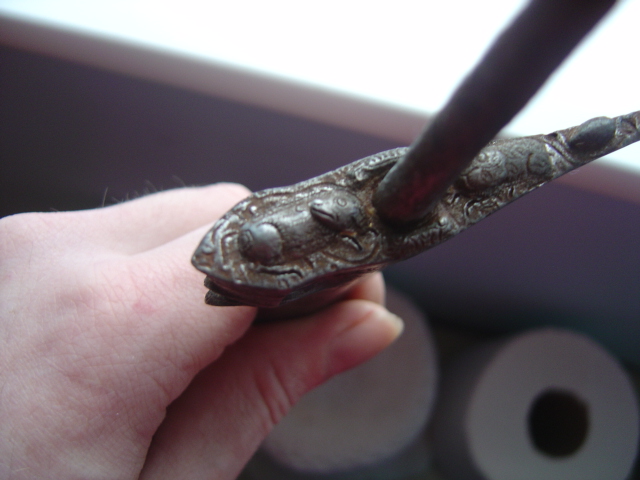 Hi guys i just got this nice Bali blade .Its another nice blade fallen on hard times placed in poor dress and sold cheep[i cant resist a nice blade ] .Im asumeing its a bali blade cause its in bali dress and because of its size[40cm from tip to ganja]and high polish and also there is a one eyed demon/deity? engraved at the bottom.There is alot of engraveing around the bottom of the blade,although unfortunately some has worn away[i get the impression that it was once heavily corroded and then re-polished].Of interest to me is the ganja witch has the strange protrusions and after some scrubbing away the dirt and rust with a toothbrush in water i was delighted to find that the two either side of the peksi are infact very intricately chizeled animals[i cant capture them very well in picture but the detail is almost microscopic with individual hairs engraved to make the fur coat]the animal nearest the pecetan im quite sure is a cow and i cant quite make the other one out yet[it is alot more corroded] but im leaning towards a cat/tiger or monkey [more cleaning should hopefuly make it clearer].Can anyone tell me the significance of these animals?there seems to be a ceremonial feel to it.Any comments and corrections welcome.