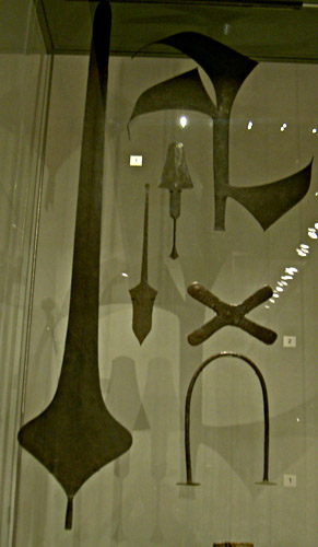 This showcase is filled with Songye (Nsapo-nsapo) axes and Kuba knives.