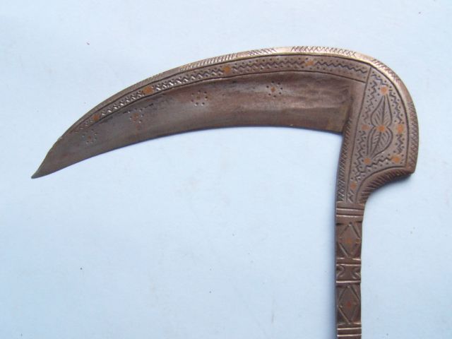 Two comments on the functionality of these as weapons as opposed to work implements. One, some of the mountain tribes used hide or metal shields in combat; the lohar would be an effective way of hooking such a shield and pulling it aside to allow for a blow from one's primary weapon. As for the awkwardness or 'tourist' value of a folding version, a little experimentaion on my part proved that a well-maintained example would open quickly with the snap of the wrist, much like a gravity knife. A shoulder holster would provide a primitive version of a 'concealed carry' weapon.