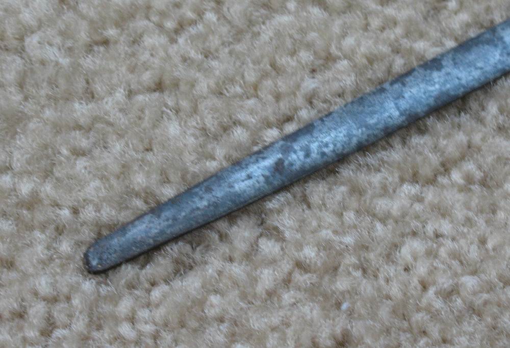 Hmmm...perhaps I spoke too soon about the blade on this piece. The pics originally gave me the impression that it was like the one on mine, a three-sided blade like those found on many short swords of the period. Having cleaned off my glasses (