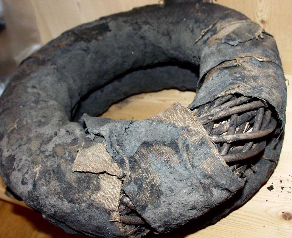 - a small Thirty Years War iron hand grenade also retaining its original filling and wooden fuse. Note the details of the fuse!