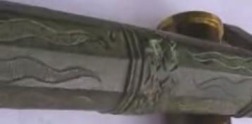 The term bronze for this sort of cast barrels has become widely accepted. In illumitated manuscripts of historic periods, however, they were called "brass" haquebut barrels (Messing Hakenpuchsen). As this, of course, depends on the actual part of the components, copper and pewter (bronze) or copper and zinc (brass), we should maybe just call them copper alloys. Metallurgical research has shown that 16th century copper alloy barrels often contain traces of silver. There is no doubt about this barrel being cast at one of the famous Nuremberg workshops the finest of which, at that period of time, were those of Beham (Peheim) und Pegnitzer. Sadly this barrel does not bear a maker's mark. Its early Renaissance bronze four stage barrel allows for a close dating to 1515-20. As only bronze barrels follow roughly this scheme of staging it shall be referred to at large here. Starting at the rear section, we have a short square section (quadratisches Bodenstück) which bears the integral back sight and pan (its cover now missing) and is decorated with a scale pattern and a fir-cone scale frieze (Tannenzapfenschuppen-Fries). Next, divided by an incised double line and fish scales cast in high relief, there is a long twelve sided section (Hinterstück), followed by another, shorter twelve sided section (Mittelstück) which is shifted to the first and also divided from a long round section (Vorderstück) by two incised lines and a fish scale frieze. Divided by another fish scale frieze and two incised lines, a moulded band between, there is an elongated muzzle head (Mündungskopf) bearing a long integral fore sight. The rounded hook is cast to about the middle of the barrel and is incised with a primitive sign composed of various dashes and symbolizing a cypher: this, of course, is not a mark but an improvised form of a number still found in a similar manner, in markings on beer mats today. This fine and important piece retains its original oak stock attached by three iron nails which enter through two barrel loops beneath the rear end and before the muzzle head respectively, the one in the middle entering through a piercing in the hook. Its statistics are: overall length 207 cm, barrel 126 cm, cal. 26 mm, overall weight 35 kg, barrel 25 kg, stock 10 kg. With these measurements it was actually a piece of light artillery, not a long gun. It was mounted on a wooden tripod and two men were required to fire it: one for aiming the piece and, this done, the second for igniting it (Richt- und Feuerschütze). I attach two watercolor sources of illustration from the Maximilian arsenal inventories, early 16th century, showing a somewhat more archaic form of of the barrel. Note the headline in the first referring to the arms as "Maximilian Messing hagkenpuchsn" (brass barrel haquebuts). In the woodcut by Erhard Schön, Nuremberg, ca. 1530, the same primitive way of imitating cyphers is depicted on a slate board in a saloon scene. Michael |