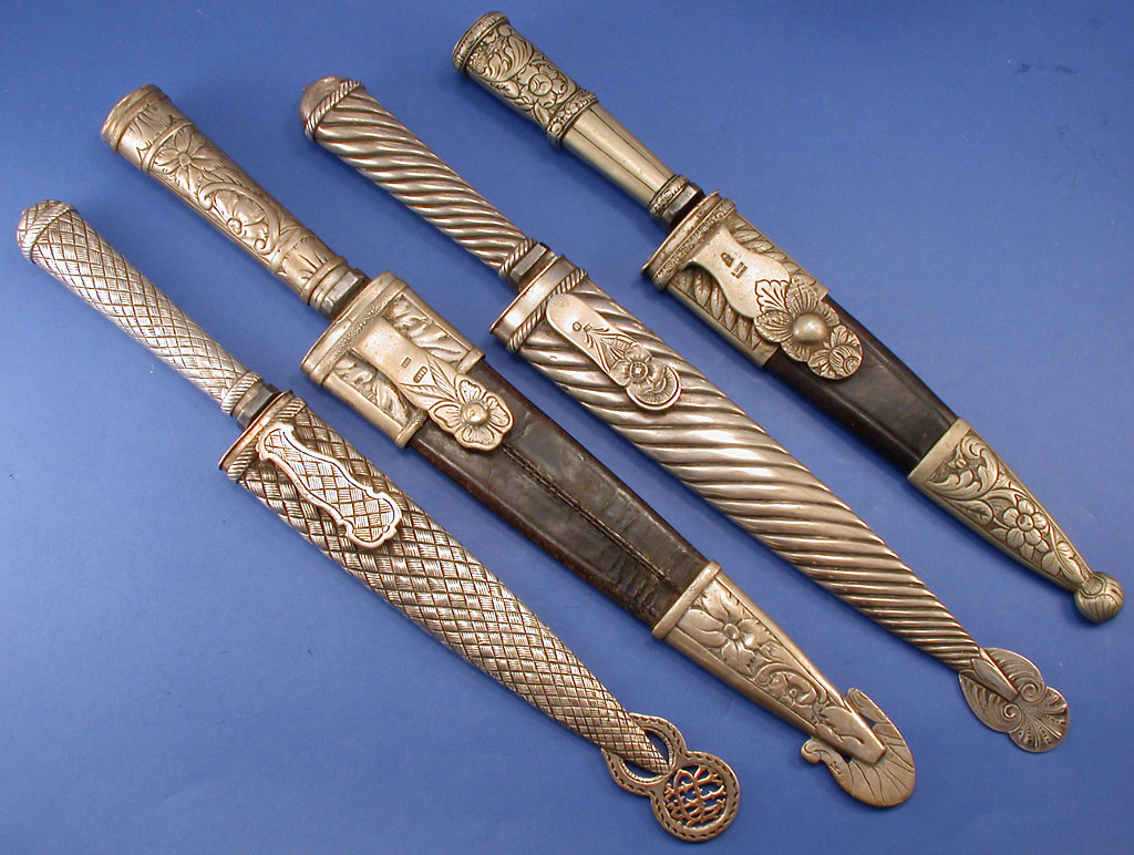 Squared "Buttons" Photo 18. Four Argentine puñales, mounted in silver, showing their square bolsters or botón cuadrado (rectangular in overall cross section, but with facets replacing what would have been sharp edges, so actually octagonal). Notice also the semicircular notch on the ricasso, used to rest the index finger and prevent the hand from slipping towards the edge when stabbing. Photo 19. Same knives of previous picture. Sheaths completely made of silver or leather with throat and tip of silver.