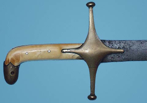 Hilts, while exhibiting a multitude of local variations of form and greatly variable styles of decoration, do retain a core of common features. The quillions (crossguard tips) may exhibit a number of styles: moderate length with rounded button like terminals in the classical Persian style (see #1 and #2 above), stubby and bulbous in Indo-Muslim varieties (as with #3 above) and longer and more drawn out in Arab and Turkish examples (see #4 below). The quillions arise from a centrally thickened and convex crossguard assembly from which integral langets also almost universally arise and extend towards the blade's tip. The langets vary in bulk, often being more delicate on Persian influenced examples and more robust on Indian types. Aside from their obvious assistance in seating the sword in its scabbard, some authors posit a role for the langets as sword catchers or breakers in combat, but such a role seems unlikely for those more delicate hilts crafted of softer metals. A metallic grip is integral to the crossguard assembly in the typical Indo-Muslim hilt, however in the more Persian influenced varieties a symmetric reflection of the langet extends into an inletted area on the grip, which may be formed of two cheeks or blocks of material such as ivory, bone or horn which are riveted into place. Indo-Muslim hilts may rely entirely upon adhesives for attachment to the tang, while in Persian examples the crossguard assembly will be secured by adhesives and the attachment of the grips supplemented by rivets. While tangs may extend the length of the hilt, they are also often shorter. The wire wrapping over the portion of the grip adjacent to the crossguard, seen most frequently on Arab variants, but not entirely lacking in Indian contexts, most likely originated as a reinforcement of an area of the hilt most likely to experience early failure. In swords of classical Persian form, beyond the width of a single hand, the grip turns at roughly a right angle to the axis of the hilt in the direction of the edge. This short extension is covered with a pommel cap, usually decorated in or complementary to the style of the crossguard assembly. The angle and length of this pommel may vary such as with the longer pommel cap arising at a more acute angle on the likely Syrian Arab example (#4 below) or in the form of a bulbous expansion on Turkish examples. In some Indian examples, a knuckle bow will arise from the quillion on the edge side and extend back towards the pommel; a similar function may be served by a chain with Arab styles. The hilt may terminate as a beast's head on more luxurious examples, and such luxurious examples may adopt unique forms beyond the scope of this discussion of the basic characteristics of working grade weapons.