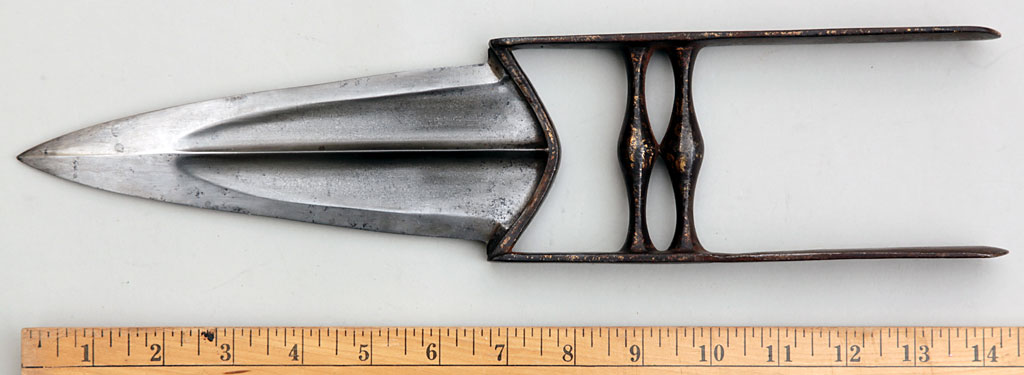 This is a fine example of a jamadhar ('death tooth') dagger, better though perhaps incorrectly known as a katar; a style of dagger limited to the Indian Subcontinent. This example is typical in its overall form, having a straight double edged blade abruptly arising from a curved cross piece (hilt base) to which are attached hand and wrist guards parallel to the blade on either side and a grip formed by a pair of cross bars that are focally joined at their center. Most of the hilt elements show residual traces of gold koftgari, however there appears to be an old weld on one of the guards just beyond the grip and an absence of remaining decoration beyond this area suggests that the extension may be a replacement. The 7¾ inch (19.7 cm) blade of this example proximally has a sharply defined high central mid rib on each face flanked on each side by a deep fuller; immediately beyond the fullers the blade reaches a maximum thickness of 0.42 inch (1.06 cm) for an armor piercing tip that takes on a flattened diamond cross section. Most noticeable within the flats of the fullers is a bold high contrast wootz grain indicative of very restrained forging and creation of the bold mid rib and fuller topography by chiseling (stock removal). A very few patches of minor superficial discoloration and pitting are present. Overall length is 14.3 inches (36.6 cm) with a weight of 18¾ ounces (535 grams).