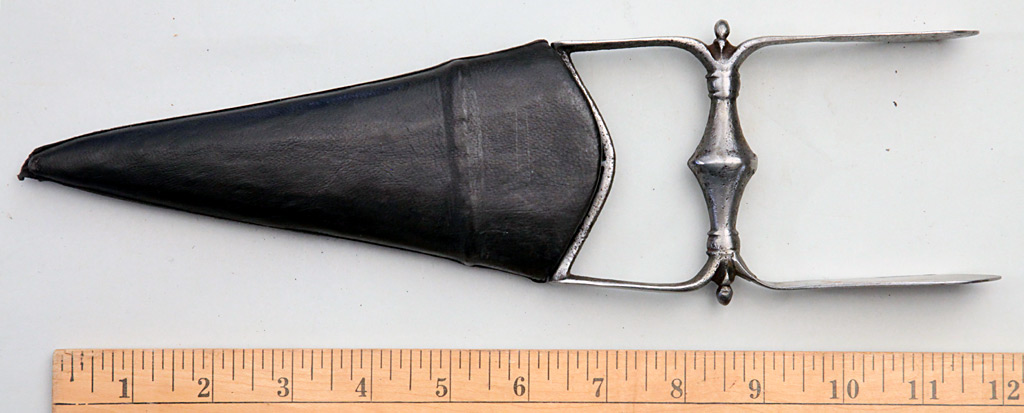 The double-edged blade is 6½ inches (16½ cm) long with a central midrib on either side and a thickened (reinforced) point (up to 0.2 inch (0.5 cm) in thickness. Some areas show dark brown rust and pitting, but the majority has been ground and polished for a bright metal surface and in foci are discolorations suggesting a light etch in search of grain. The oxidized layer under the curved bar from which the blade originates suggests a refurbished old munitions-grade katar, however a more recent casting cannot be excluded. The dagger is accompanied by a recent leather covered wood sheath. Overall sheathed length is 12 inches (31 cm) with a weight of 9¾ ounces (282 grams).