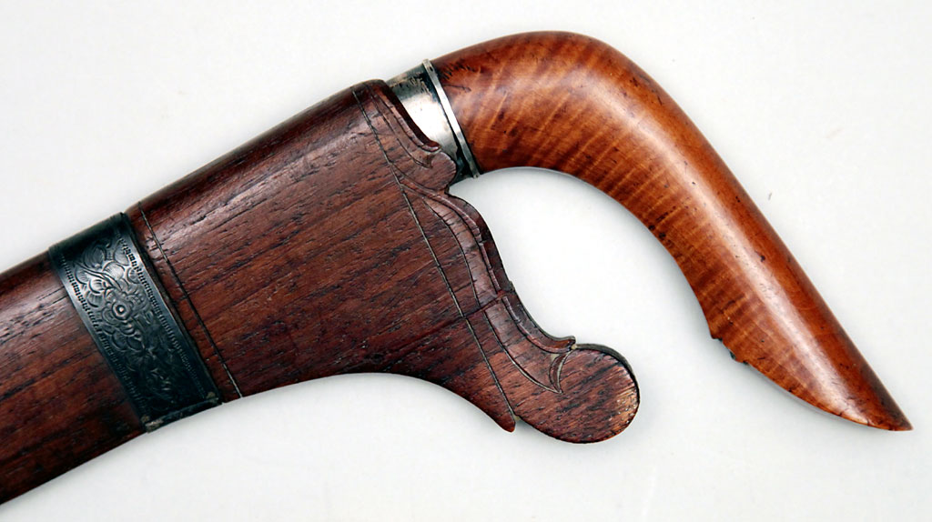 The single edged blade is beveled on each side symmetrically and expands from its narrowest width of 0.7 inch (1.8 cm) near the hilt to a maximum of 1.6 inches (4.1 cm) just shy of halfway to the tip. The back is very slightly convex while the edge shows a prominent 'belly' as measured above. The 8 7/8 inch (22.5 cm) blade shows dark areas and brighter areas with tool marks from manufacture or later burnishing. There are multiple patches of old dark discoloration and mild pitting and in some cases curving lines suggestive of boundaries of water damage. Also noted are a few forging flaws that remain tightly closed. The 'tiger-stripe' wooden hilt is set off by a silver ferrule, and turns in the direction of the edge at about an 80 degree angle. The end of the hilt terminates angled toward the edge. Overall length of the badek, measured parallel to the back of the blade, is just over 11½ inches (29.2 cm) with a weight of 7.5 ounces (212 grams). A darker wooden scabbard composed of two sides accommodates the badek and features a widened, scrolled area at the mouth. The scabbard halves are bound together by a blackened metal band with floral decoration. It appears that another band was once present just above the foot at the end of the scabbard. Within the sheath, the length is just under 13 inches (33 cm) with an overall weight of 10 2/3 ounces (303 grams).