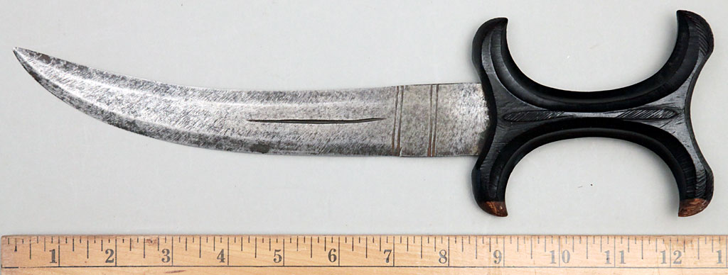 This style of 'X-hilted' dagger is typical of the Beja Hadendoa or Beni-Amir peoples of Eritrea and the Sudan that live along the southwestern shores of the Red Sea. The dark brown wooden hilt has lighter sapwood at the tips of the arms on one side and is decorated with geometric carvings on the faces and the outer tips of the back arms (see bottom photo). The curved double edge blade has slightly convex faces from which each side is beveled to the edges. There is a short narrow fuller on each face and two pair of lines across the forte of the blade perpendicular to its length.The faces show an age darkened patina except for brightening over the high points, with an abundance of diagonal striations from finishing or honing and some patches of shallow pitting and discoloration. The length of the dagger with hilt is 12½ inches (32 cm); the blade alone is 8¾ inches (22.3 cm) in length and the weight is 7.3 ounces (208 grams).